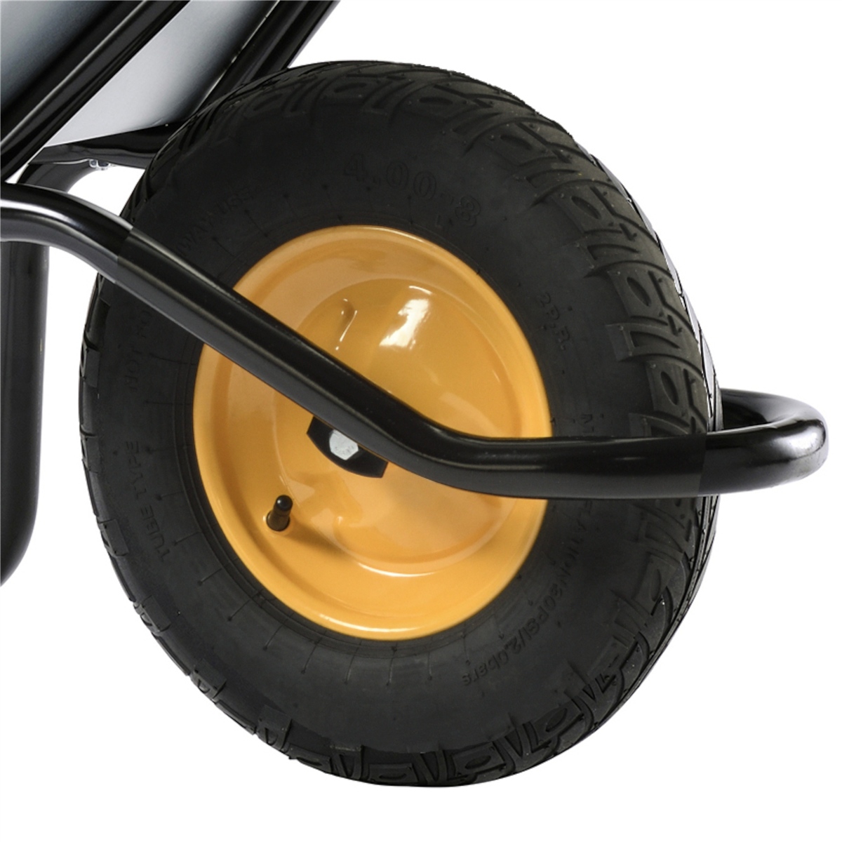 Neues Alpha-Gestell, mit einem eingeschweißten Stützteil, das den Boden sowie die Front-Mulde einbettet, um eine perfekte Stabilität bei der Schubkarrenbenutzung zu sichern. Das Alpha-Gestell ist ergonomisch und unverformbar. 2/3 der Last wird vom Rad getragen, die Holmlänge reduziert die Anstrengung.
