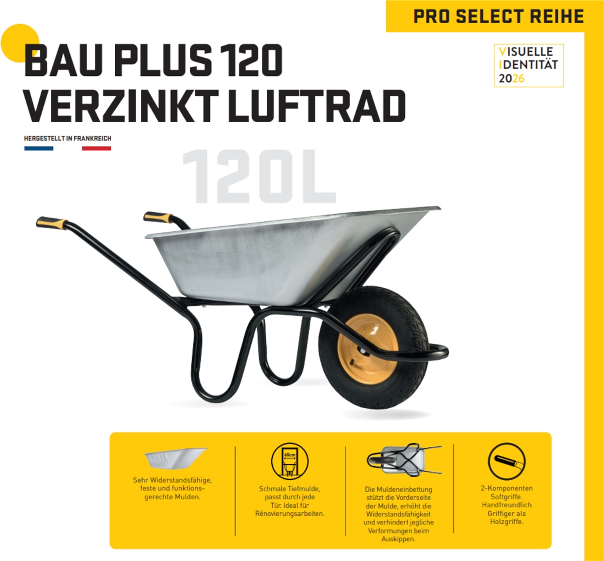 Die Haemmerlin BAU PLUS 120 Schubkarre gehört zur Profi-Oberklasse für anspruchsvolle Bau-, Renovierungs- und Gartenarbeiten. Das geschweißte, hochstabile ALPHA-Stahlrohrgestell mit integrierter Muldeneinbettung sorgt für maximale Verwindungssteifigkeit und verhindert Verformungen selbst unter hoher Belastung. Die verzinkte 120-Liter-Tiefmulde ist korrosionsbeständig, schlagfest und durch ihre schmale Bauform ideal für Innenbaustellen, da sie problemlos durch Türen und enge Zugänge passt. Kugelgelagerte Lufträder mit 400 mm Durchmesser und ergonomische 2-Komponenten-Griffe runden diese hochwertige Profischubkarre ab.