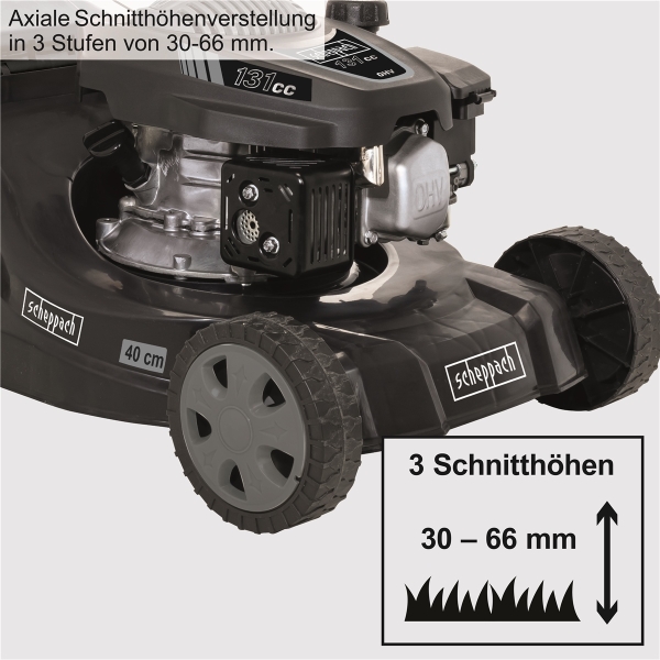 - Schnitthöhenverstellung in 3 Stufen (30 – 66 mm)