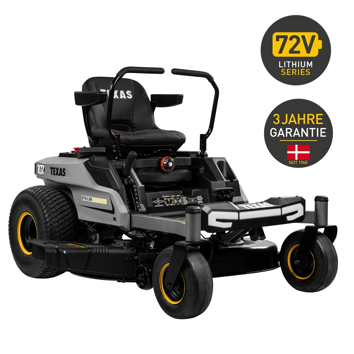Der TEXAS Epsilon ZT10700Li ist ein innovativer Zero-Turn-Akku-Rasentraktor, der mit seiner intuitiven Steuerung, einem kraftvollen 72V-System und einem riesigen 44 Ah Akku selbst große Rasenflächen bis zu 6.000 m² effizient meistert. Die 107 cm Schnittbreite, 12-fache Schnitthöhenverstellung und drei Schnittgeschwindigkeiten machen ihn zum idealen Partner für anspruchsvolle Gartenbesitzer. Dank der 360° schwenkbaren Vorderräder ist höchste Wendigkeit garantiert – ideal für enge Passagen und komplexe Grundstücke.
